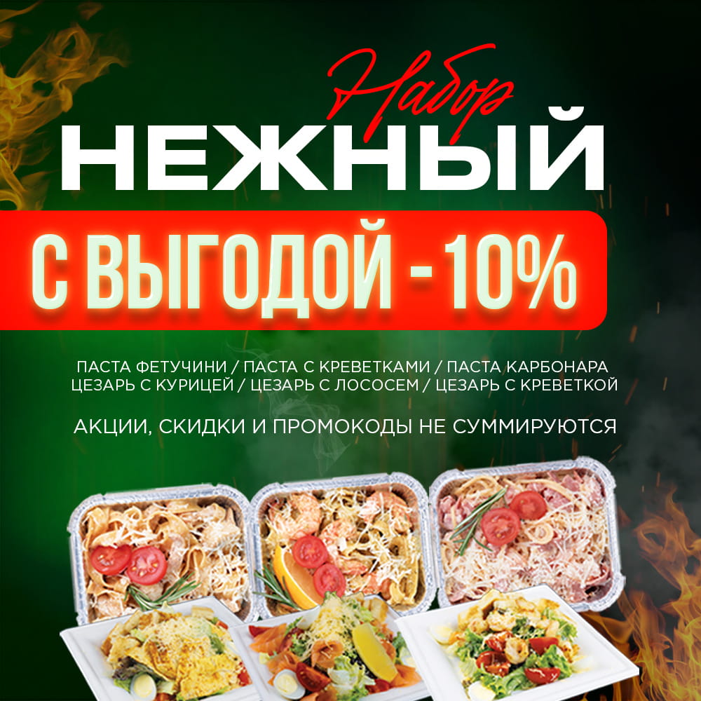 2 Пасты "Фетучини с куриным филе и грибами" + пицца 25 см. "4 Мяса".