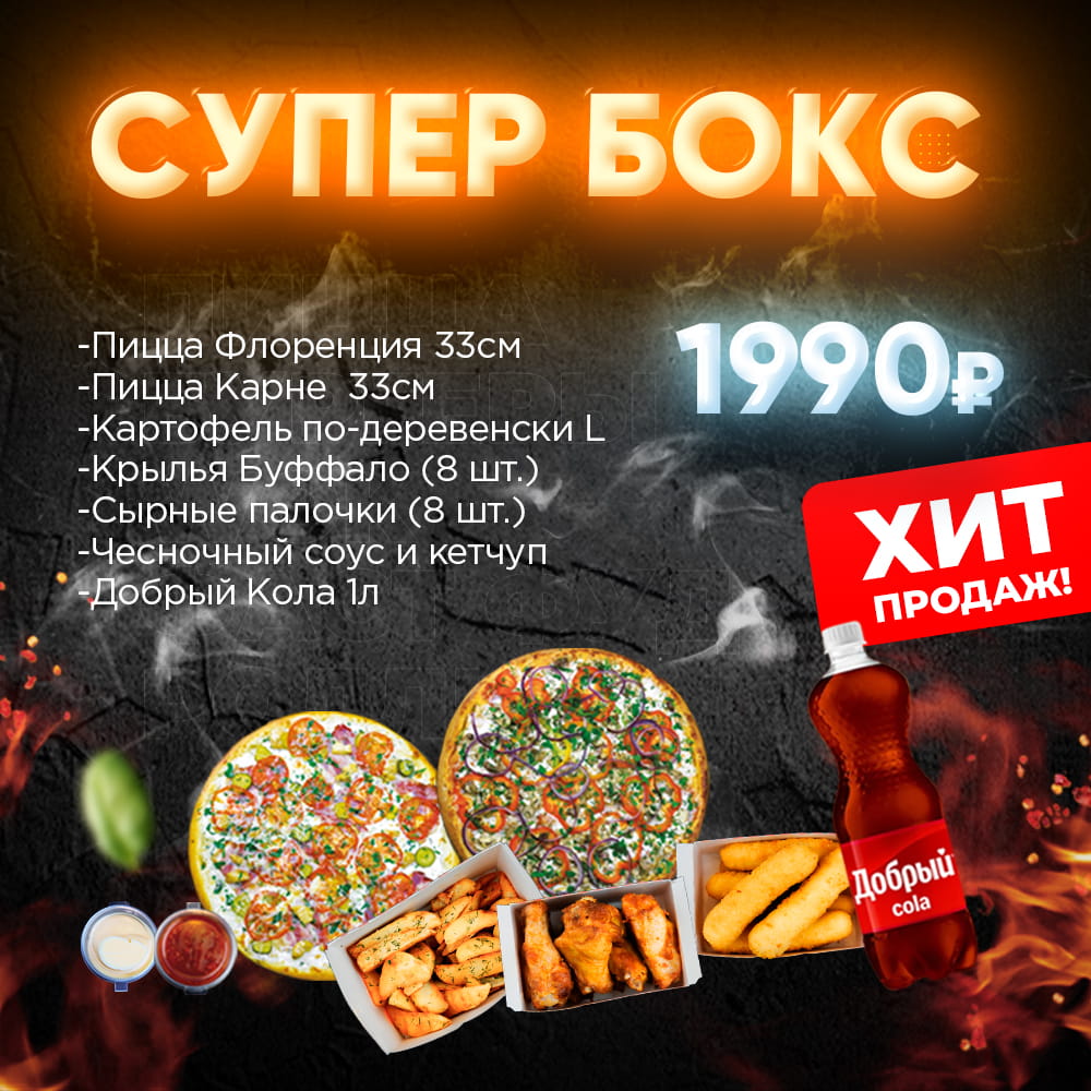 Пицца "Флоренция" 33 см., пицца "Карне" 33 см., картофель по-деревенски, крылья буффало 8 шт., сырные палочки 8 шт.,Добрый кола 1л., чесночный соус и кетчуп.